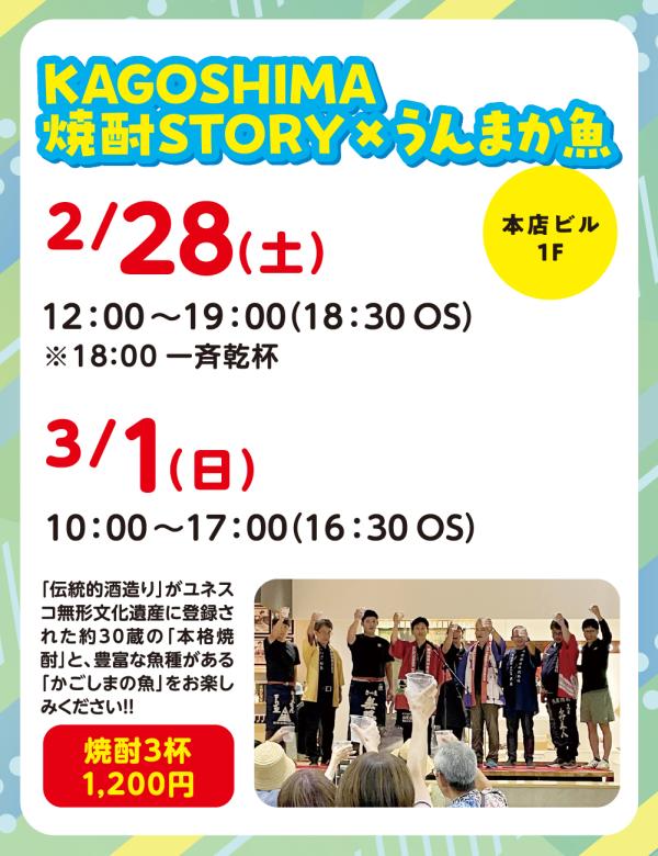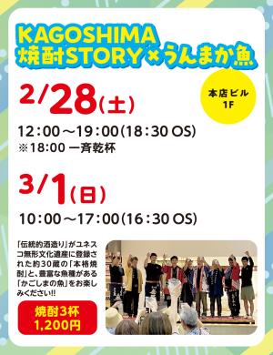 2/28-3/1 KAGOSHIMA焼酎STORY×うんまか魚 KAGOSHIMA焼酎STORY×うんまか魚は、2026年2月28日(土)12:00~19:00(18:30オーダーストップ)※18:00一斉乾杯、3/1(日)10:00~17:00(16:30オーダーストップ)、鹿児島市のよかどKAGOSHIMA本店ビル1階で開催される。 大海酒造、小鹿酒造、若… …続きを読む ▶