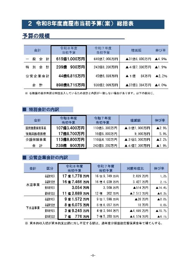 鹿屋市の令和8年度一般会計当初予算615億1千万円 4.9%減 令和8年3月鹿屋市議会定例会は、2月18日開会され、次の議案等34件が上程された。 令和8年度鹿屋市一般会計予算 令和8年度鹿屋市国民健康保険事業特別会計予算 令和8年度鹿屋市後期高齢者医療特別会計予算 令和8年度鹿屋市介護保険事業特別会計予算 令和8年度鹿屋市水道事業会計予算 … …続きを読む ▶