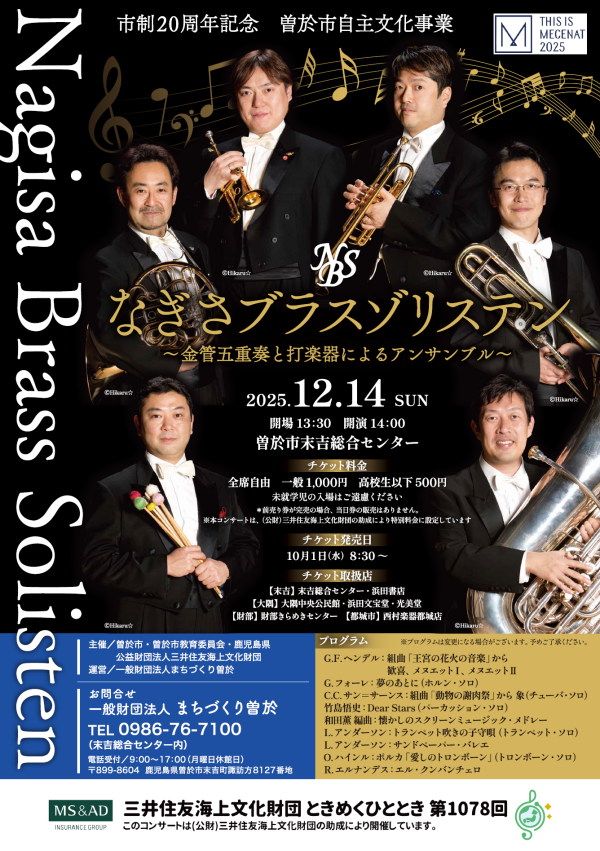 12/14 なぎさブラスゾリステン 金管五重奏 打楽器アンサンブル 曽於市自主文化事業「なぎさブラスゾリステン~金管五重奏と打楽器によるアンサンブル~」は、令和7年12月14日(日)午後1時30分開場・午後2時開演、曽於市末吉総合センターで開催される。 市制20周年記念曽於市自主文化事業、三井住友海上文化財団ときめくひととき第1078回なぎさブラスゾリステン~金管… …続きを読む ▶