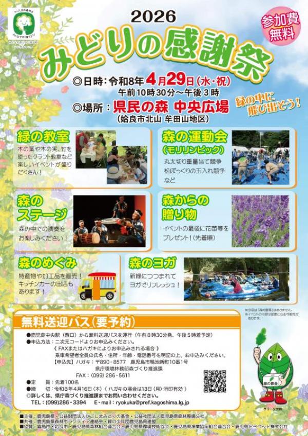 4/29 潤ケ野緑の少年団が表彰され活動発表 みどりの感謝祭 2026みどりの感謝祭は、令和8年4月29日(水・祝)10時30分~15時県民の森中央広場(姶良市北山牟田山地区)で開催されるが、緑の少年団知事表彰で、志布志市の潤ケ野緑の少年団が表彰され、活動発表を行う。 「みどりの感謝祭」は,「みんなの森づくり県民税」を活用して,自然の中で遊ぶことの楽しさや森… …続きを読む ▶