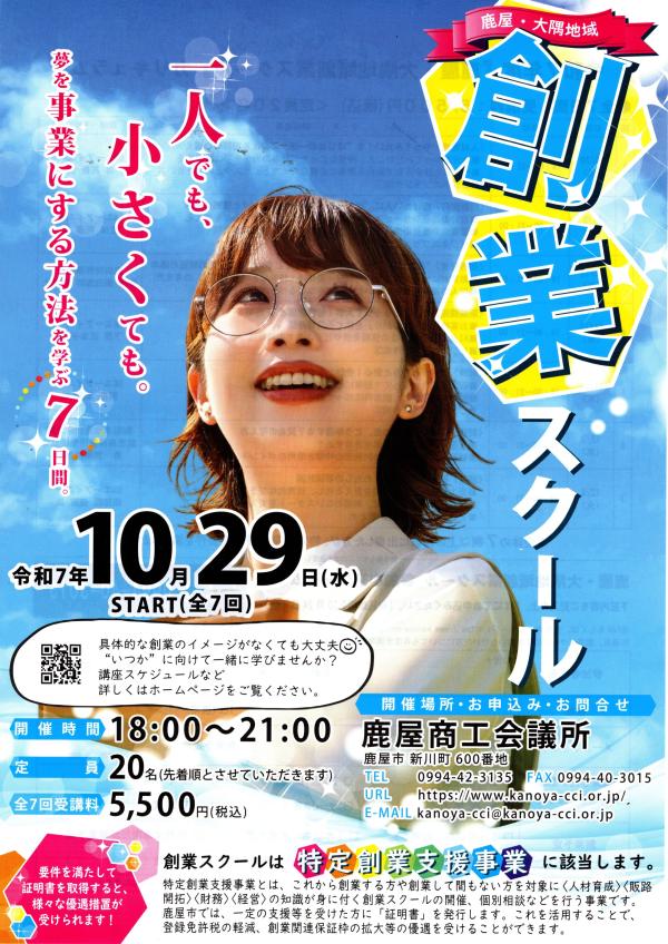 10/24〆切 10/29~7回 鹿屋・大隅地域 創業スクール 鹿屋・大隅地域 創業スクールは、10月29日(水)18時~21時を第1回に計7回、鹿屋商工会議所で開催され、参加者を募集している。 創業したいけど、どうすればよいのか分からない。創業資金を調達したいけど、どうすればよいのか分からない。そんな時には「鹿屋・大隅地域 創業スクール」! 鹿屋商工会議所が… …続きを読む ▶