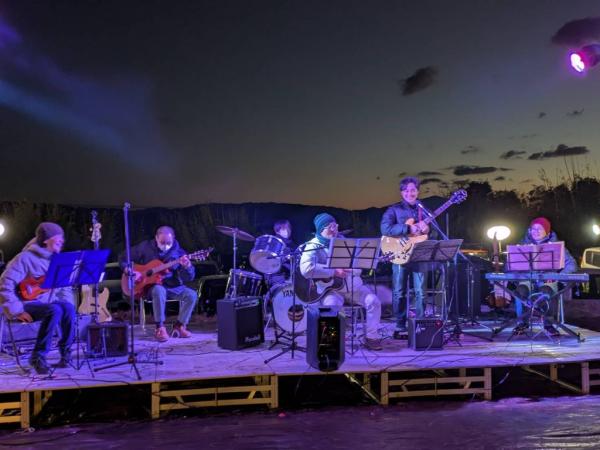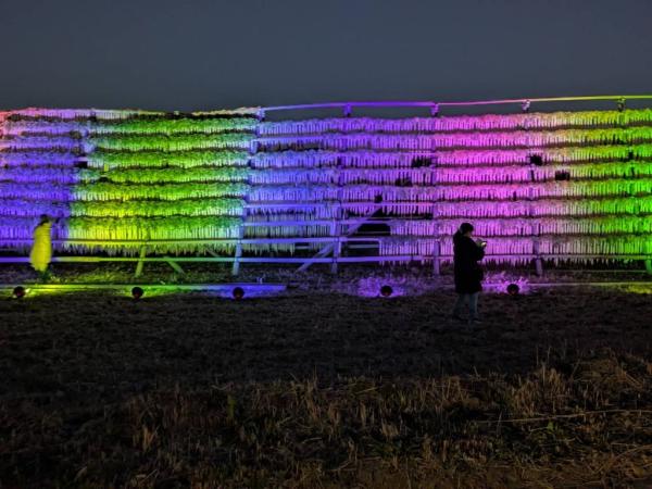錦江町神川の宿利原地区大根やぐらのライトアップが、令和7年12月25日から始まり、暗闇の中、色白の大根が赤や青などの光に照らされ、幻想的な雰囲気を醸し出した。最終日の27日はマルシェも開催された。