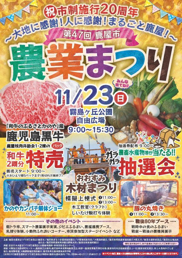 第47回鹿屋市農業まつりは、2025年11月23日(日曜日)9時00分~15時30分、霧島ヶ丘公園自由広場(鹿屋市浜田町1250)で開催される。