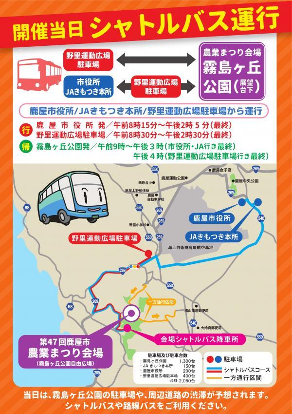 当日は、会場周辺で交通規制がありますので、渋滞が予想されます。シャトルバスや路線バスをご利用ください。…と呼び掛けている。