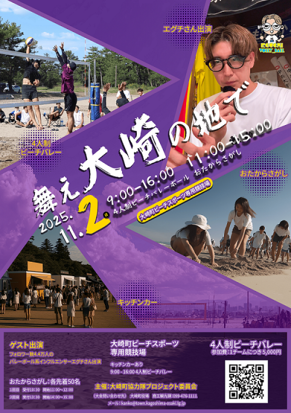 舞え大崎の地で2025は、2025年11月2日(日曜日)8時30分から2025年11月2日(日曜日)16時00分、大崎町ビーチスポーツ専用競技場で開催、参加者を募集している。