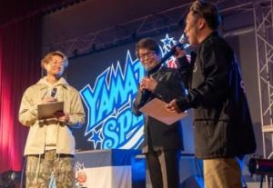 餅まきが始まると、大きな歓声とともに、懸命に餅を拾い、中には1万円や千円が当たり、宮迫浩二さん百合子さん夫婦は1万円の入った餅をゲット、それぞれたくさんの餅やお菓子を手にし、カツオなどと交換していた。
