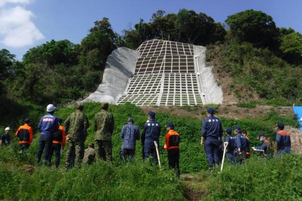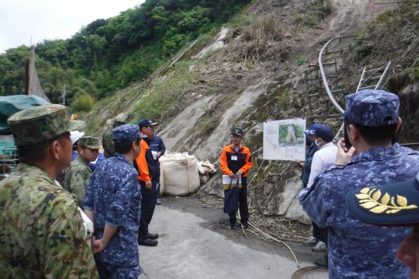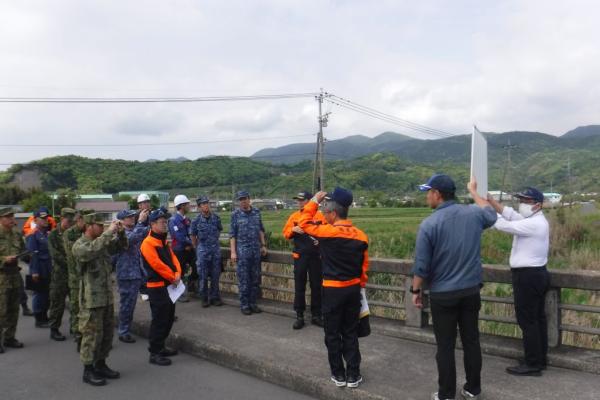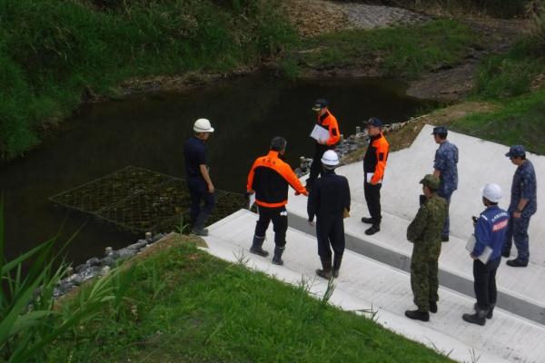 この日は、市役所職員、垂水幹部派出所、陸・海自衛隊、垂水出張所の職員ら参加し、三角ため池、法面防災工事、本城川寄り洲、柊原小裏治山現場をそれぞれ視察点検した。