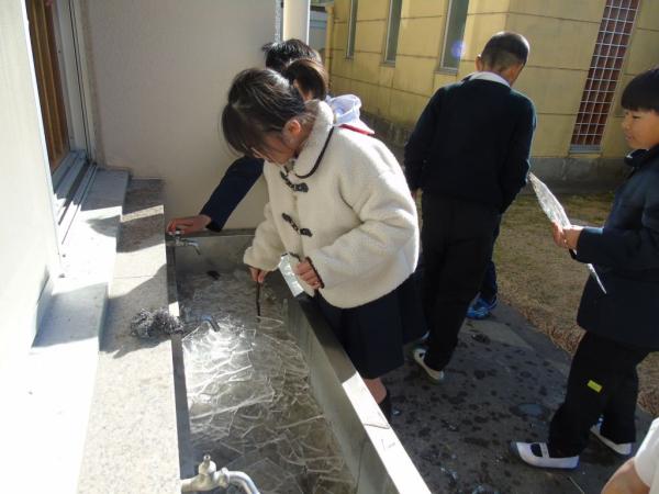手に持っては冷たーい、寒波で池一面に張った氷…東原小