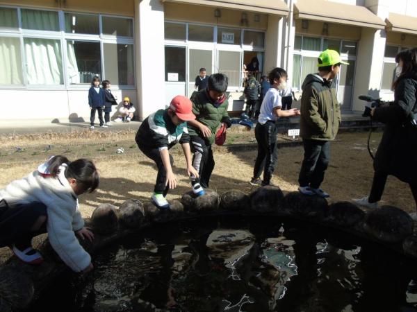 大隅半島でも雪が舞い散ったが、翌9日朝、鹿屋市東原小学校での取材中、休み時間に児童らが校庭と中庭の池に集まっていてにぎやかな声。