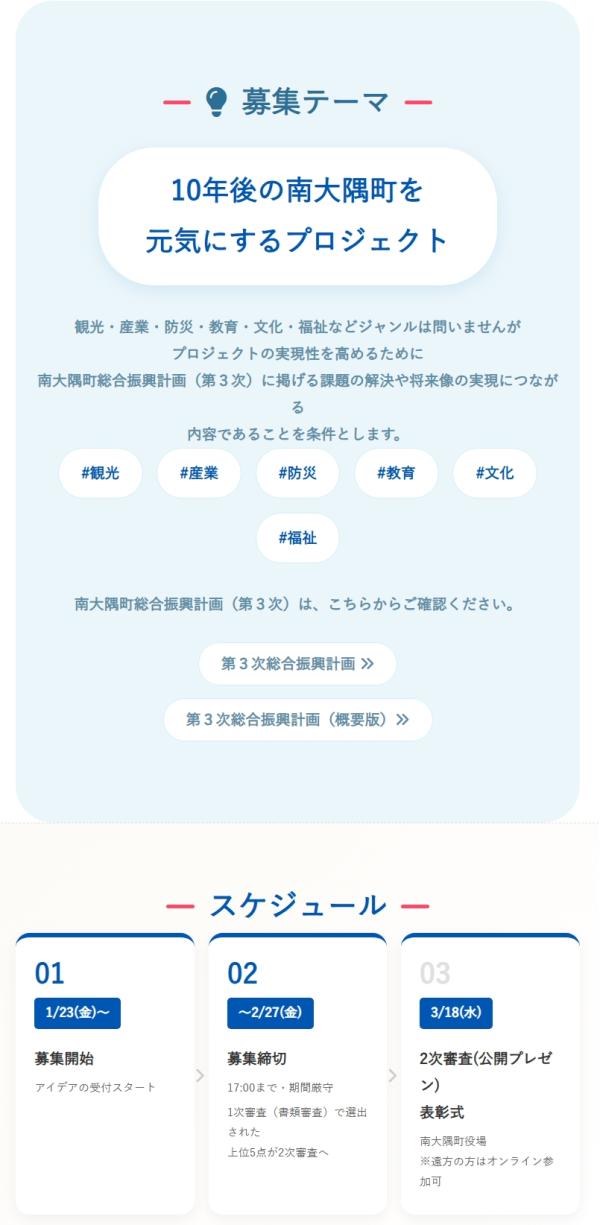 3/18(水)に2次審査(公開プレゼン)、表彰式が南大隅町役場である。※遠方の方はオンライン参加可
