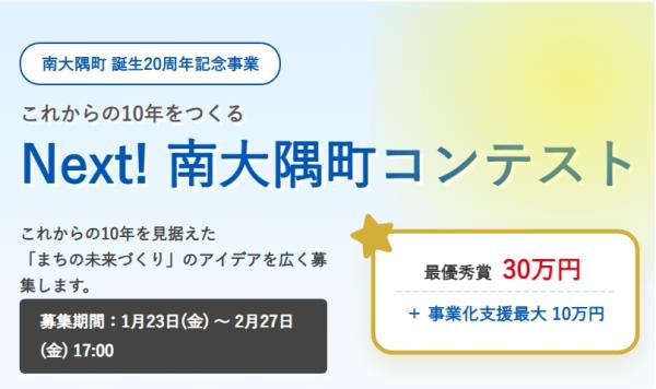 Next!南大隅町コンテスト~10年後のまちをデザインしよう~は、令和8年2月27日(金)17:00まで1次審査募集締切で、アイデアを募集している。