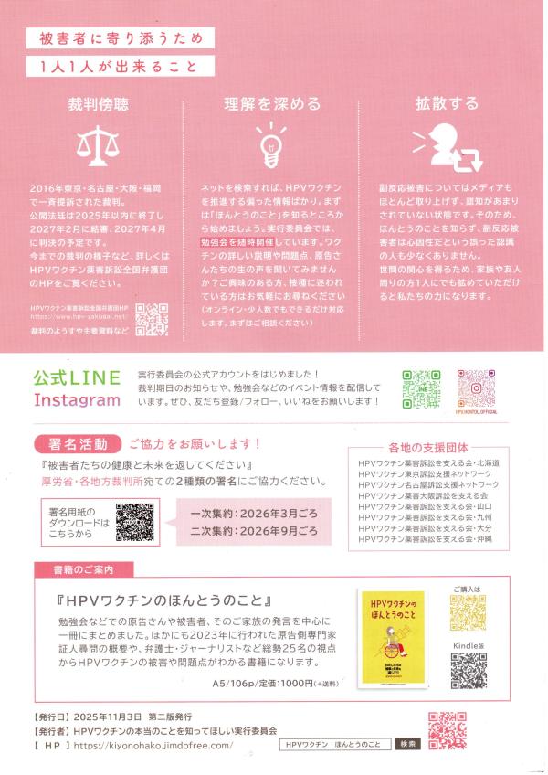 ただ、周りにはワクチンに対してかなりナーバスになり、あるいはとても攻撃的に反応される方々、極端な人もいてその時に受けた思いを引きずりながら、HPVワクチンにも接していたが、「わたしたちの健康と未来を返して!」という訴えには、他人事でないような気もするようになった。