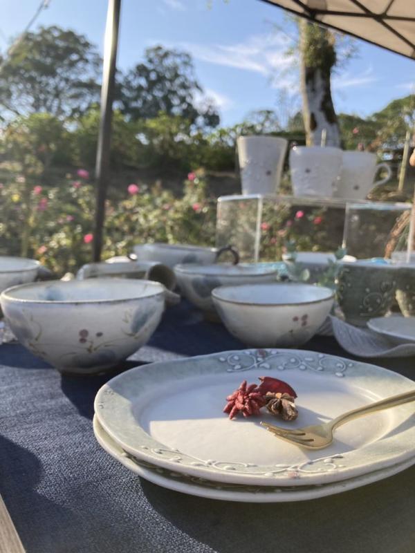15、16日共に風も無く穏やかで日中は暖かい天気に恵まれた。鹿屋市内外の飲食5店舗がコーヒー、キンパ、ベーグルやお弁当、温かい豚汁を用意し、鹿屋市、鹿児島市、姶良市、霧島市、宮崎県から参加した陶器店9店舗が並んだ。