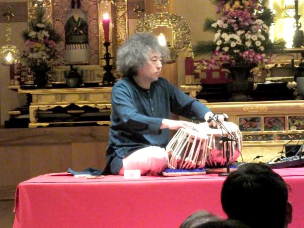 当日はライブ前に、境内でマルシェも開催され、飲食の出店、美味しいカレーやたこ焼き、昔ながらのおこわや芋団子、カンボジアのビ-ルも本数限定で販売され、マルシェを楽しんでから、ライブとなり、U-zhaanさんのタブラと、新井さんのサントゥールとの心に響く圧倒的な演奏に酔いしれていた。