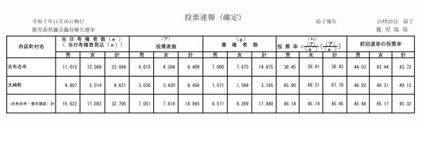 町長選出馬のための辞職で欠員の出た県議会議員選志布志市・曽於郡区補欠選挙は、令和7年11月3日、投開票が行われ、ともに無所属新人2人が争い、新人の久井仁貴さん(35)が初当選を果たした。