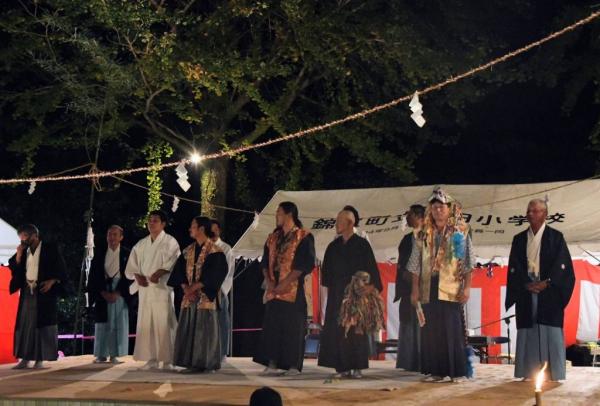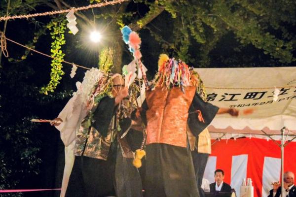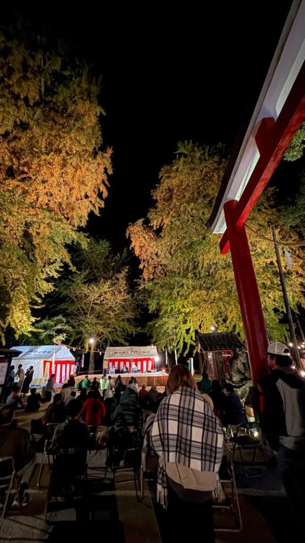 イチョウライトアップ×神舞×夜市の「旗山夜市」がについて、令和7年11月23日(日)錦江町池田地区の旗山神社で開催され、伝統芸能の神舞の披露や地域の子供たちによる屋台もあり賑わった。