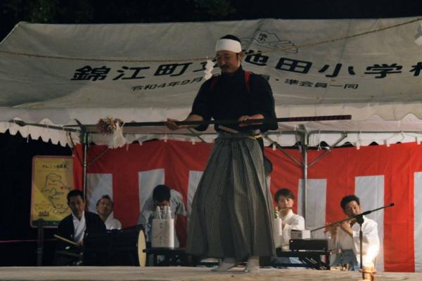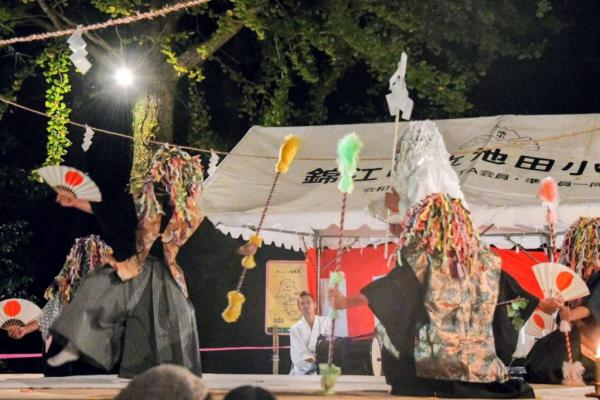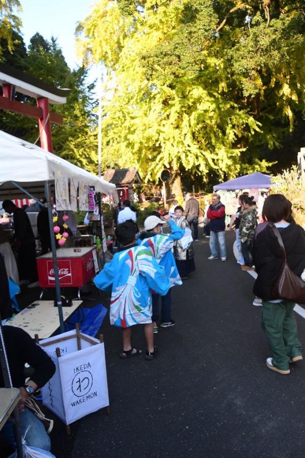 旗山神社境内の周辺には、地域の子どもたちが考えた『こども屋台』をはじめ、池田わけぇもんの会、クラシックブドウ浜田農園、やすこ工房(豚汁) などの飲食出店が並び、ステージイベントでは、大隅竜神太鼓による演舞、池田神舞保存会をはじめ、地域の大人、子ども達による神舞奉納の舞が披露された。