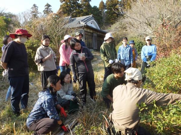 この日も、庭の雑草や茂り過ぎた庭木の剪定方法、気水脈のメンテナンス等の講義を受けながら、参加者がノコ鎌、剪定鋏で庭木の手入れをし草木の勢いが穏やかになる切り方を実践。