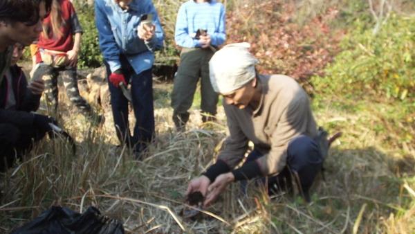 気水脈では、なぜ土砂崩れがおこるのか、水溜りやぬかるみができやすいのか、なぜ冠水するのか等、土中のしくみや植物の役割を学び、移植ゴテ使ってその土地に合った水の流れを実際掘りながら学んだ。