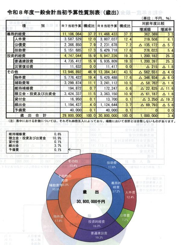令和8年度一般会計当初予算(案)は、308億円。前年度の当初予算と比較し10億円、3.4%の増で、過去最大の予算規模となっている。