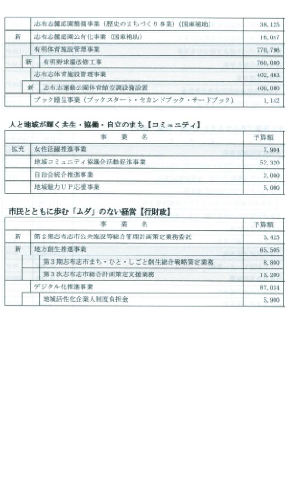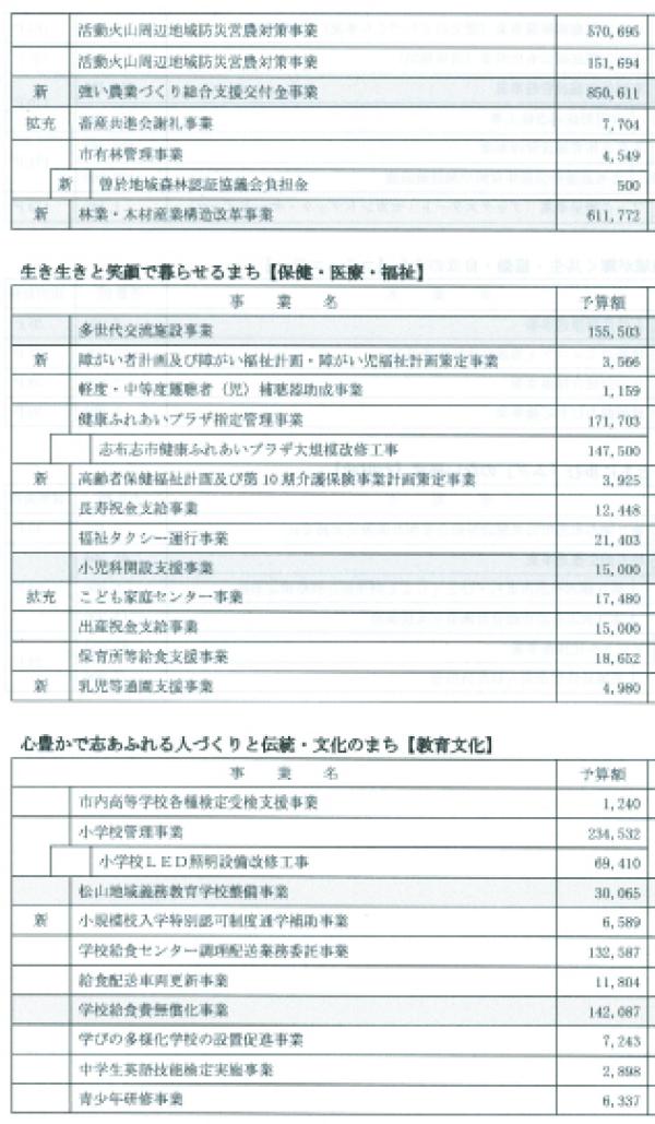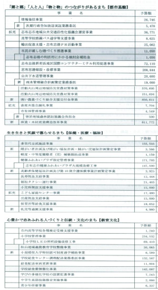 第2次志布志市総合振興計画及び後期基本計画の最終年度となることから、後期基本計画で定めた目標人口28500人の確保に資する移住施策など人口増につながる事業は継続しつつ、社会減の対策として市民一人ひとりの幸福度を高める環境整備のため、以下の4つの視点から施策を構築し、必要な予算措置を行った。