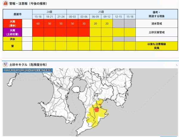 気象台は、午後3時24分に、大雨警報(浸水害)を鹿屋市、志布志市、大崎町、東串良町、肝付町に発表。