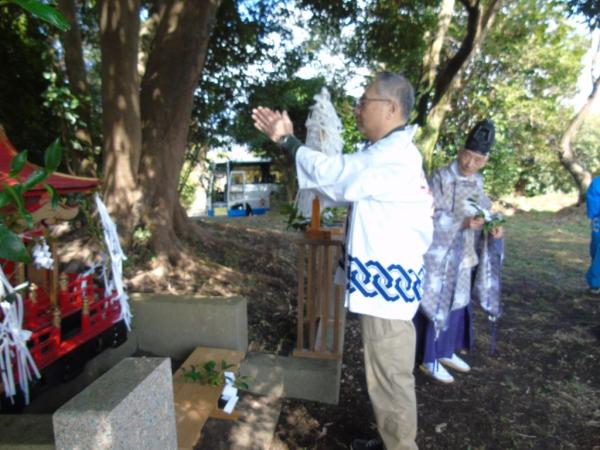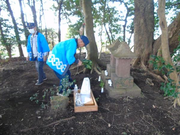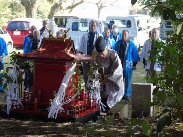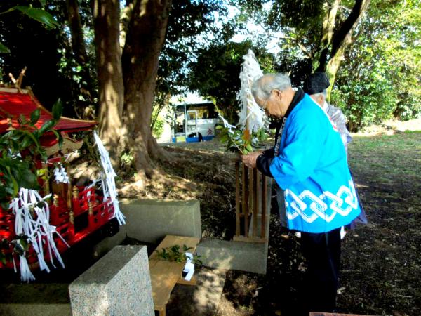 次の旅所は祓川で、同じく弓と矢を授かり、神事では、西祓川地区の福永勝町内会長、下津良人保存会会長らにより神事が執り行われ、大浦の御旅所でも神事が行われた。