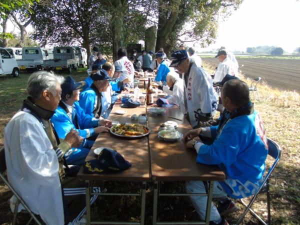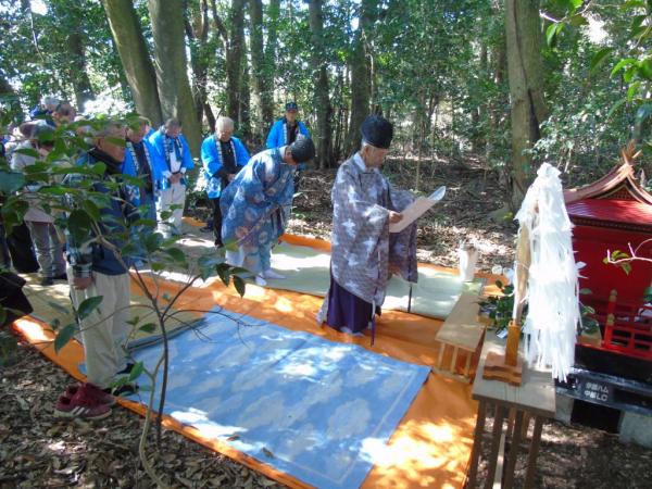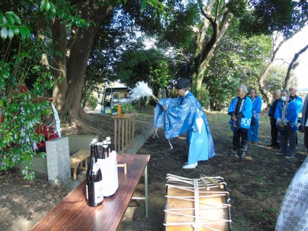 田崎神社から神輿が運ばれてきて神事があり、田崎神社境内に自生している萩の幹から作られた弓と矢を授かり、打馬地区の楠原康二町内会長や、田崎神社の吉留孝一氏子代表、田崎地区の前ケ迫清孝町内会長らによる玉串奉てんがあり、神事のあとは、両地区氏子らによる直会(なおらい)でお互いの親睦を図った。