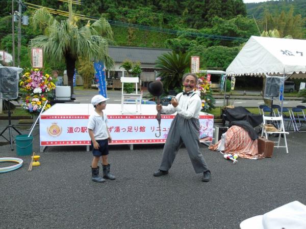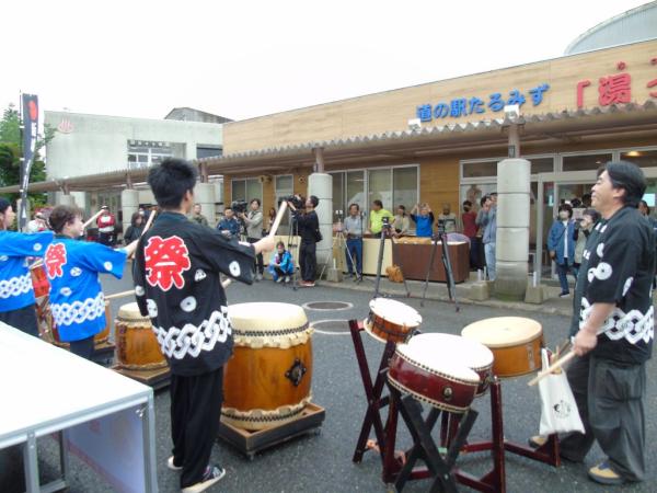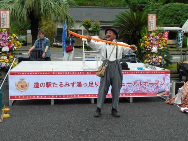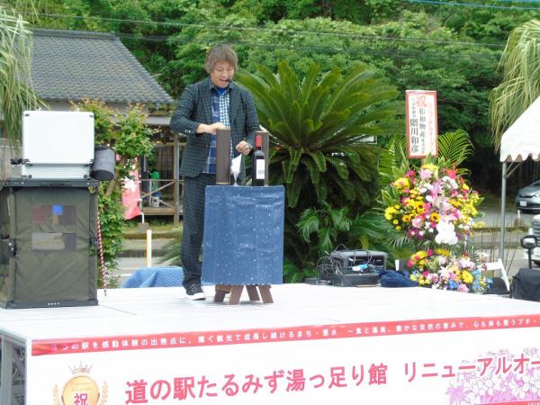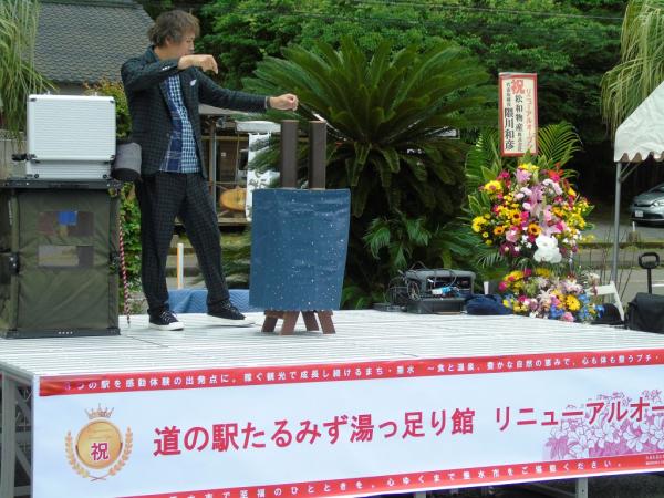 道の駅たるみず湯っ足り館リニューアル記念イベントが、令和8年4月24日、物産館前で開催され、新城神貫太鼓でリニューアルを祝い、大道芸・マジシャンには大きな拍手が沸き起こっていた。