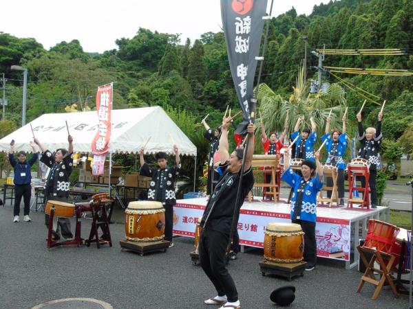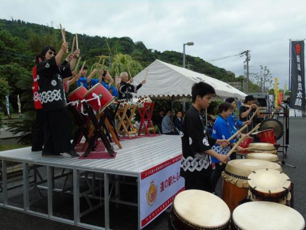 この日のセレモニーでは、尾脇雅弥市長があいさつし、新城神貫太鼓で気勢を挙げ、大道芸やマジシャンが盛り上げ、キッチンカーが並び、ガラポン抽選会では、垂水の特産品が当たるなど、行列ができていた。