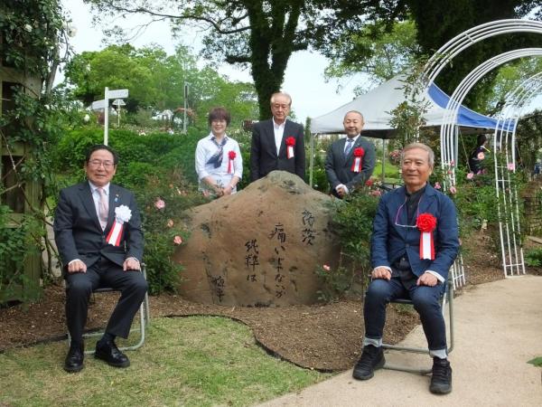 鹿屋市主催のフォトコンテストを20年以上務め、鹿屋ばら大使でもある浅井愼平氏の俳句をしたためた句碑を建立。その除幕式が行われたもの。