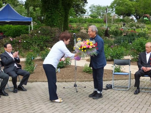 この日は、浅井氏と鹿屋市の原口学副市長による除幕。ばらを活かしたまちづくり計画推進委員会の落司ひとみ会長が浅井氏に花束贈呈。