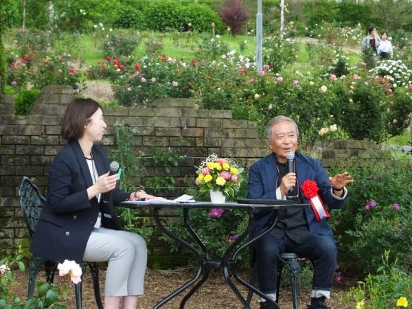 「花茨 痛いじゃないか 純粋は」の句碑をはじめ、バラのアーチ、西洋風あずまや(ガゼボ)等を整備し、より立体的なガーデンへと刷新した中での除幕式とトークイベントとなった。