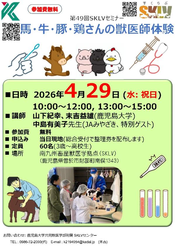 第49回SKLV(スクラブ)セミナー 産業動物獣医の模擬体験は、2026年4月29日(水・祝)10:00-12:00、13:00-15:00、南九州畜産獣医学拠点(SKLV)で開催される。
