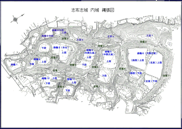 内城は大きく3つの部分に分けられ、それぞれ本丸、中野久尾、大野久尾と呼ばれ、南北朝の時代には本丸を中心とした部分だけであったのが、その後の戦乱を経て中野久尾と大野久尾が作られ規模が拡大したと考えられている。