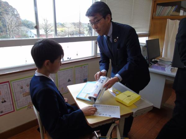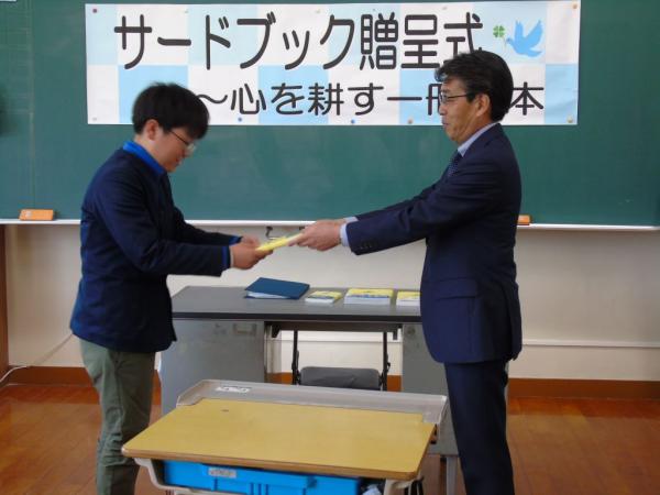 心を耕す1冊の本を贈呈する「サードブック事業」は県内でも珍しい取組で、この日は、教育長が尾野見小学校を訪れ、直接6年生児童に本を贈呈。
