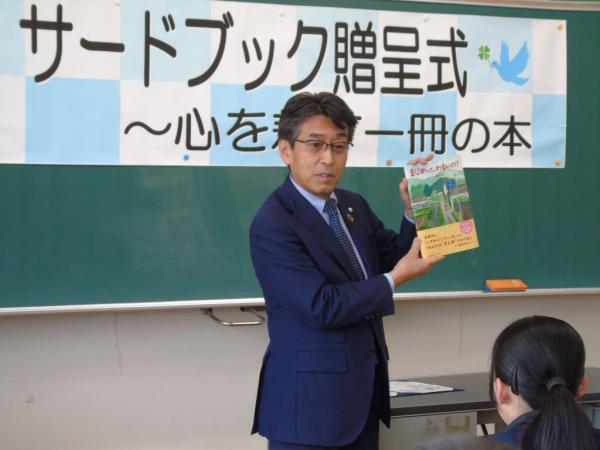 福田教育長が、「畑の土は何もしないと固まってしまい、芽が出てこない。本は人の心を耕す力がある。中学生になるための準備の一冊、新たな中学生生活の心と体の準備をしてください」など述べ、読み聞かせに選んだ本は、エミリア・アンダーソン著の「まじめって、わるいの?」
