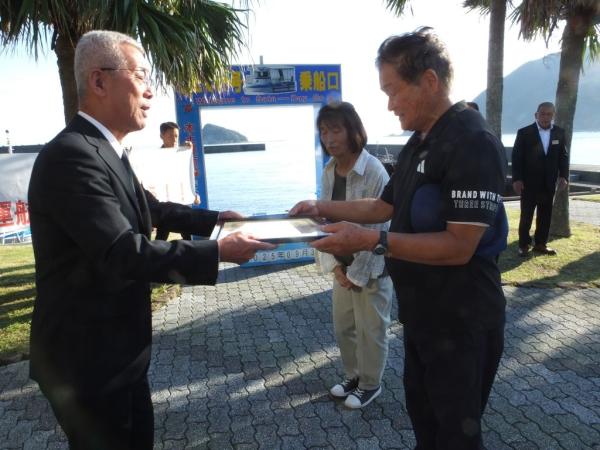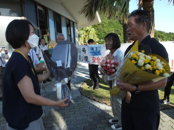 石畑町長があいさつし、濱田千昭船長から運航終了にあたっての思いが述べられ、濱田千昭、優子夫妻に花束が贈られて、その労をねぎらい大きな拍手が沸き起こった。