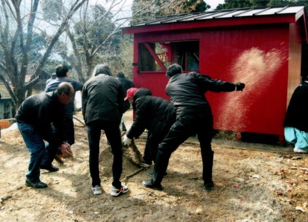 外庭にてシラス(火山灰)で山を作り、田んぼに見立て木のカギで耕きおこしの模擬を行う。