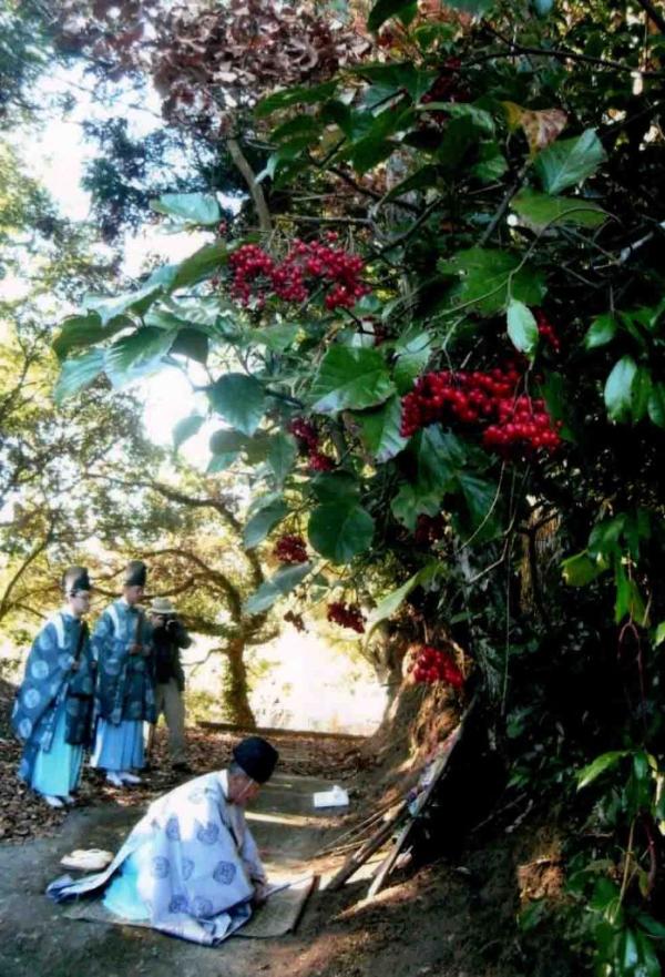 写真=本シバ アラカシ、ネズミモチ、ユズリハで組み立てられた狩り倉、弓矢でシシを射止めてかかげる神職