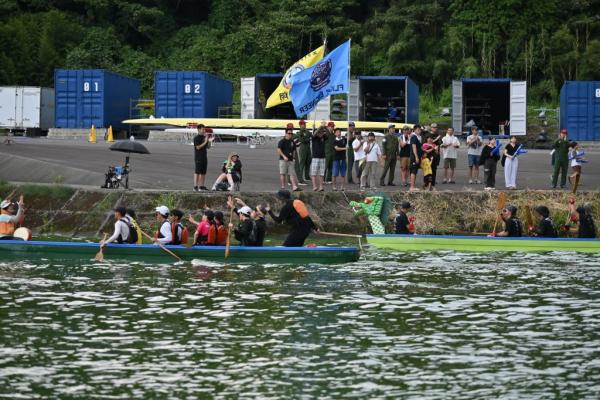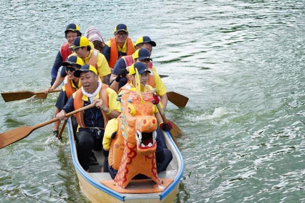 ドラゴンボートレースは、1チーム10人編成、パドラー(漕手)8人、ドラマー(太鼓打)1人、スチャーズマン(舵手)1人でレースが展開され、太鼓の音に合わせ、パドルを懸命に操りで輝北ダムコースを激漕していた。