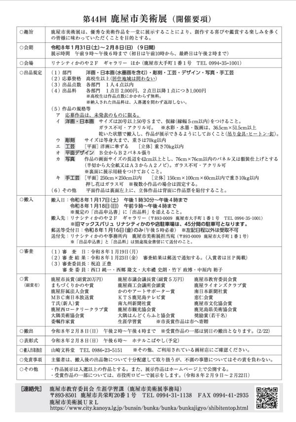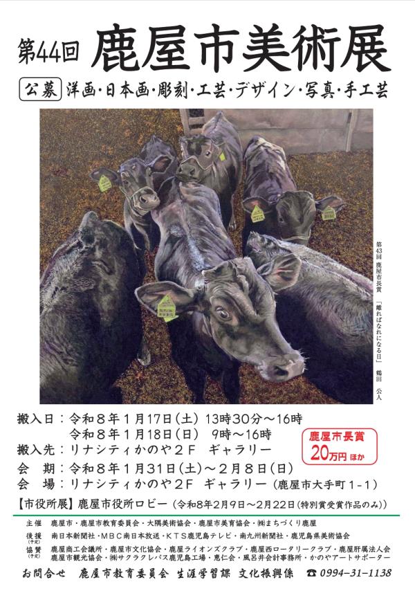 第44回鹿屋市美術展は、搬入日が令和8年1月17日(土曜日)午後1時30分~午後4時まで、令和8年1月18日(日曜日)午前9時~午後4時まで、搬入先がリナシティかのや2Fギャラリーとなっている。
