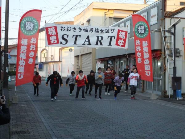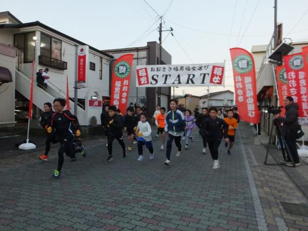 おおさき福男福女選びが、令和8年1月10日早朝から、全長365㍍のコースを走って今年の福男と福女を決めるイベントが開かれ、リレー、キッズ、一般の部男女で競われて世界陸上代表選手も激走し、リレーの部では、東靖弘前町長から中野伸一町長にバトンタッチする場面もあり、盛り上がった。