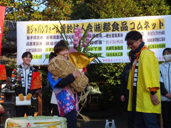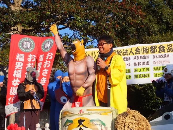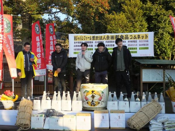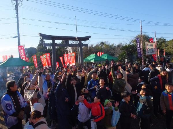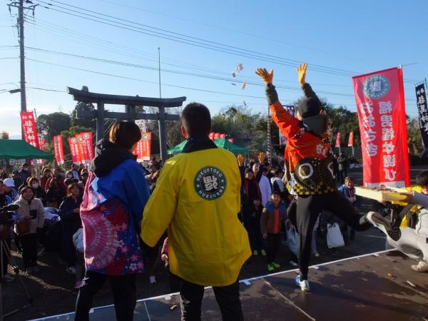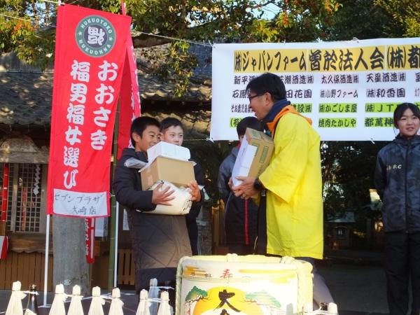 また、今年の壱番福男と福女による福のおすそ分けの豆まきがあり、景品があたるなど、参加者や地域住民らが楽しく参加していた。
