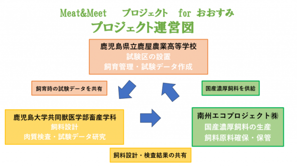 同プロジェクトは、南州農場グループの南州エコプロジェクト㈱と、鹿屋農業高校畜産科、鹿児島大学共同獣医学部畜産学科とが連携し、大隅国産濃厚飼料推進協議会を立上げ、国産濃厚飼料のみでの生産を目指す取り組み。