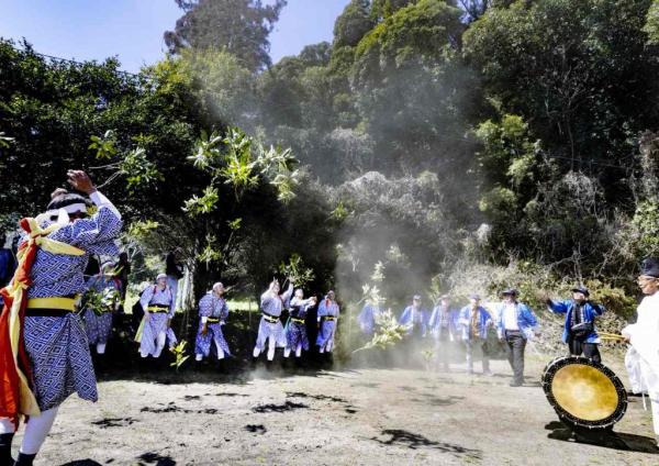カギ引きか終わるとカギ引きに使った木の柴を折り、境内を田に見立て地面を柴で叩いて「地の神」に目覚めてもらい、春の到来を告げ、柴はカシキという肥料にして播いた。