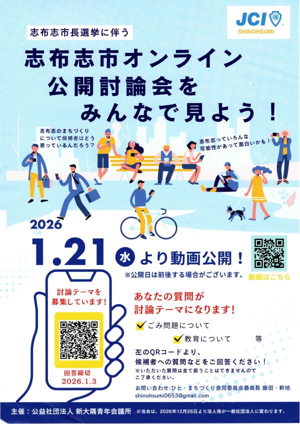 志布志市長選挙に伴う志布志市オンライン公開討論会は、2026年1月21日(水)、開催される。