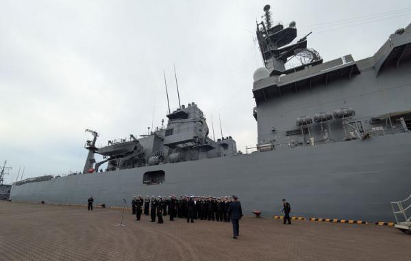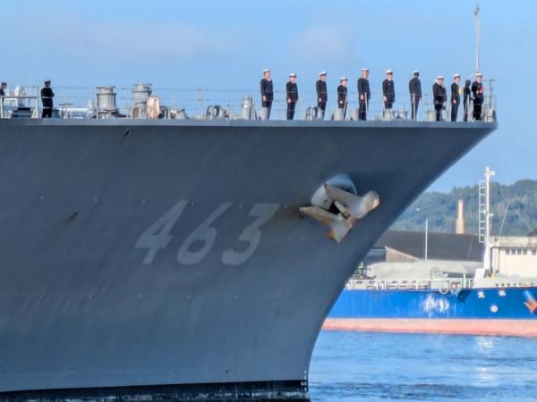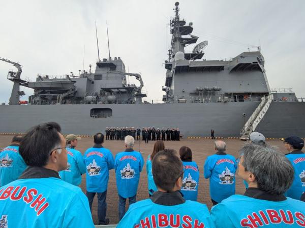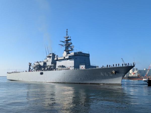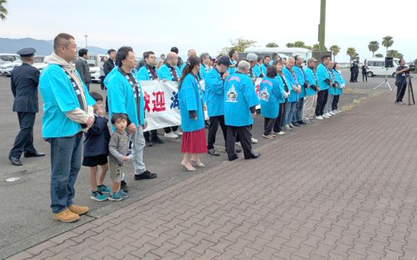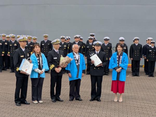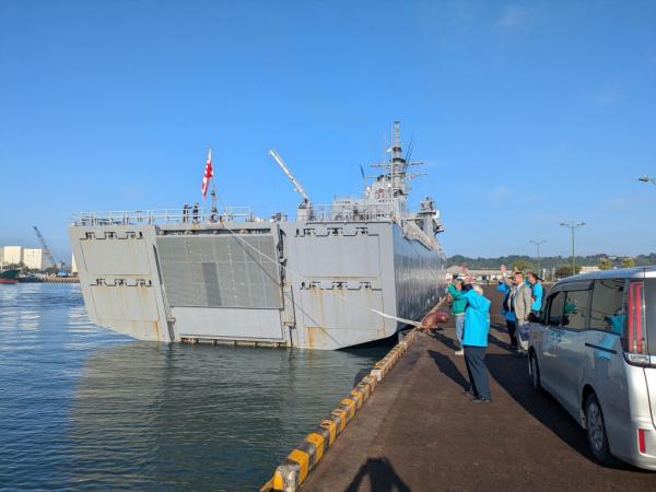 宮崎県沖の日向灘で機雷を使った日米共同訓練が始まるのを前に令和7年11月12日、志布志港に海上自衛隊の掃海母艦などが接岸、お出迎え行事や歓迎レセプションなどが行われた。