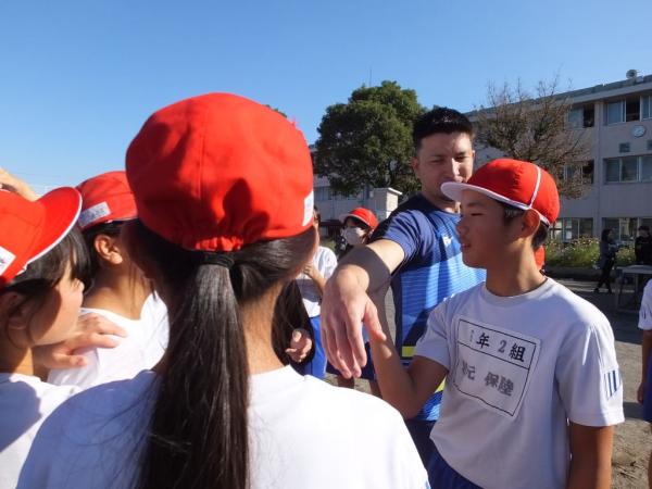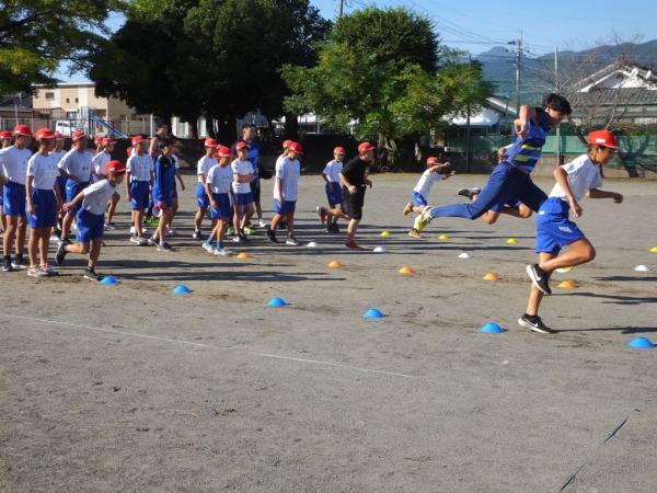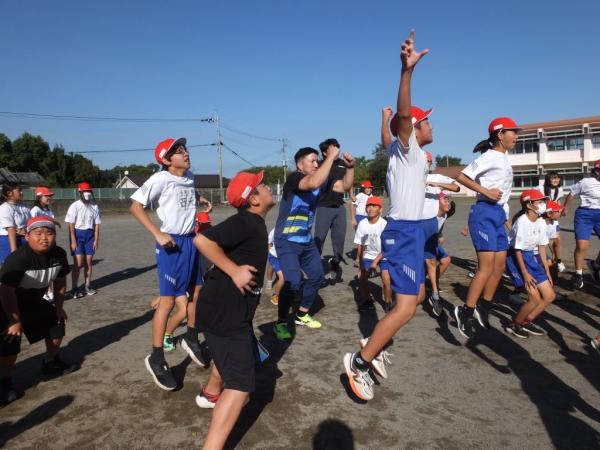 まずは、準備運動を兼ねグラウンドいっぱいを使って、児童らが日本代表3選手を追いかけタッチ、また一緒に周回を走りった。