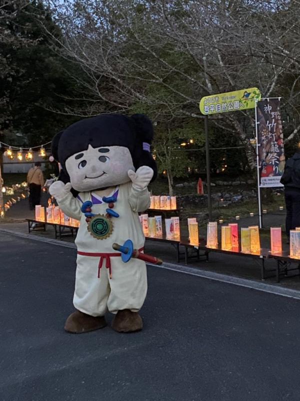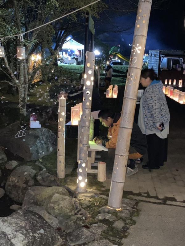 会場の同公園は、姶良川の清流と周辺の自然とがマッチした風景の中で、普段でも訪れる人たちを癒してくれるが、この日は、地元の町内会や協議会が中心となり、また地域の子どもたちの手作り作品も並び、夕暮れ時になって竹灯籠が灯されると、その灯りが清流の水面にも映え、神秘的な世界を創り出していた。